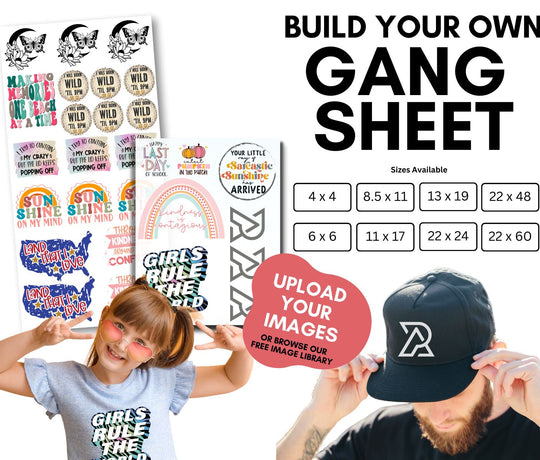 Our partners at So Fontsy offer a gang sheet builder allowing you to upload your own images to be printed as transfers. Gang Sheets are available in a wide range of sizes from 4"x4" to 22x60".
